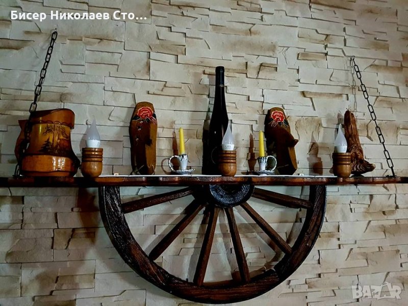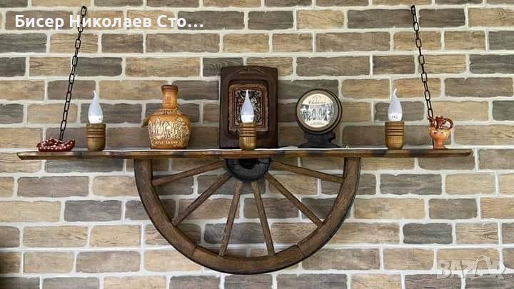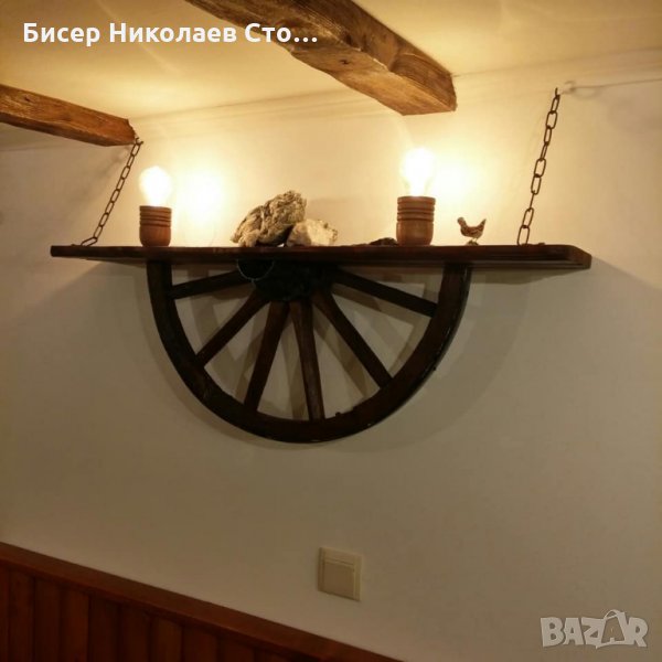 Изработвам рафт-лампа от автентични реставрирани колела на каруци!Дължина на дъската 120 см,ширина 19-20 см!цвета на лака е по избор-кестен,орех,дъб,махагон,венге,палисандър,яхтен.Фасунгите могат да бъдат Е 14 или Е 27!Разгледайте всичките ми обяви!Рафта може да се изработи и с лед осветление-129лв!Разгледайте всичките ми обяви!