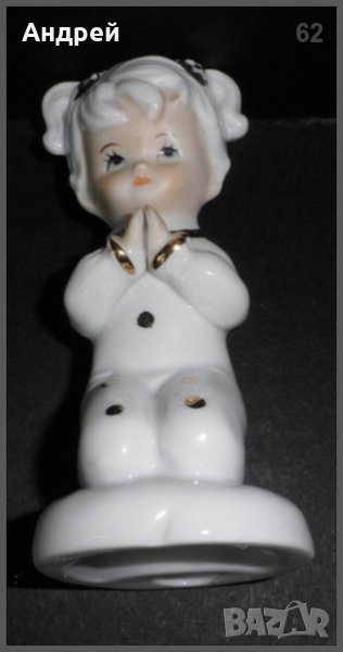 Порцелановата фигурка е нова(има етикет отдолу), и представлява красиво момиче застанало в молитвена поза,да се моли.Съдейки по етикета,порцелана, от който е направена е корейски.Красивата порцеланова фигурка,може да придаде романтична нотка на украсата Ви,или да обогати колекцията Ви,ако сте ценител.Размерите и са:височина-10 см.,диаметър-5 см.