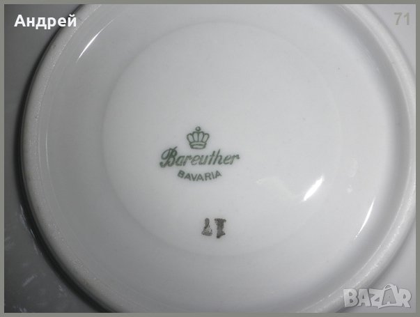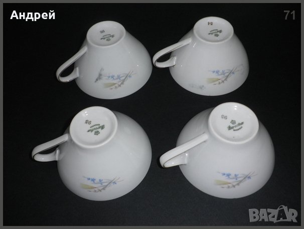 Лота се състои от порцеланови чинии - 6 броя с диаметър-14,5см,и 4бр. чаши за кафе.Чиниите са с размер, позволяващ да се използват,както за десерти,така и като подложни чинии.Инкрустирани са с красива картина-цветя,а щемпелът на гърба им показва,че са от качествен немски(Бавария) порцелан .Ръба им е със златен кант. Чашите съответстват по украса и производител на чиниите …