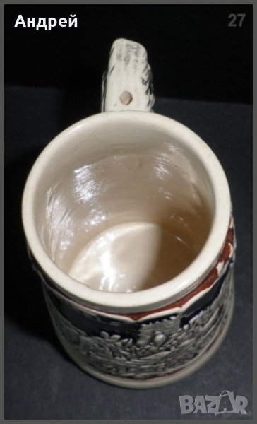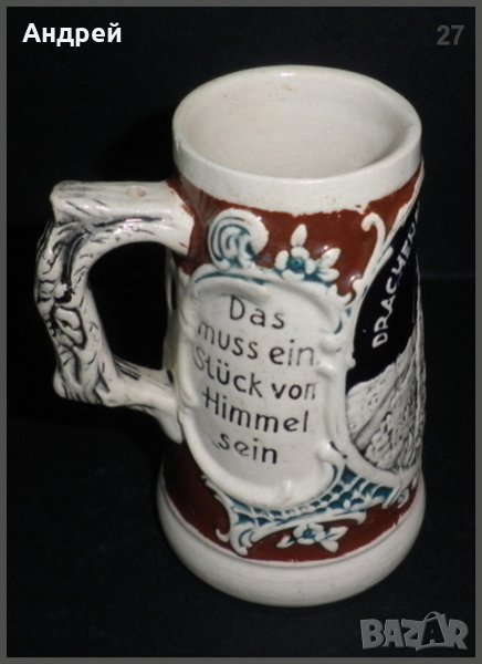 Със своите нетрадиционни размери(диаметър-с дръжката е 8,5 см.,а вместимостта е… 100ml.) керамичната халба е по-скоро за декорация,отколкото за употреба.За ценителите би била достойна придобивка към колекцията…