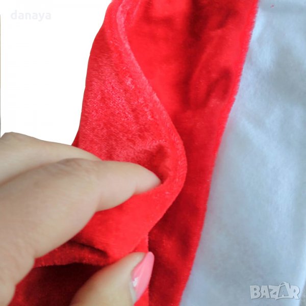 Класическа коледна шапка в бяло и червено, парти аксесоар за Коледните и Новогодишните празници. Червената част е изработена от плюшен плат, а бялата част от полар. Стандартен размер - 29см ширина и 41см височина на шапката.