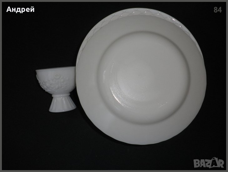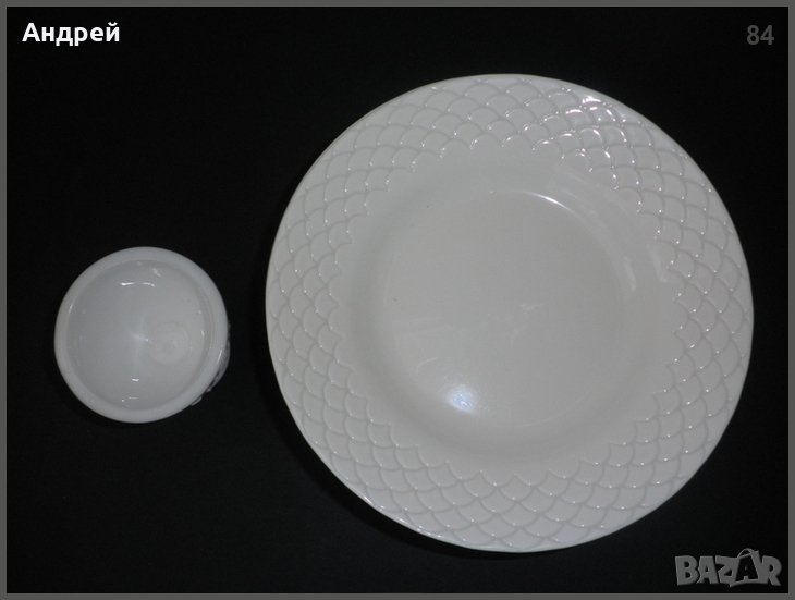 Комплекта е от 10 броя дълбоки аркопалени чинии с красива инкрустация.Според надписа на дъното на чиниите,аркопала е от френски произход.Диаметърът им е-22,6 см.,а това че са дълбоки,ги прави „многофункционални”-за сервиране,красота…и т.н.-по Ваш избор.Те са с изчистен вид и стилна декорация,а цвета им е бял,но „клонящ”към слонова кост.А подаръка, за който става дума в заглавието е много красив,чисто бял и с релефна декорация…свещник.Той също е от аркопал и освен по предназначение,може да служи и за украса.