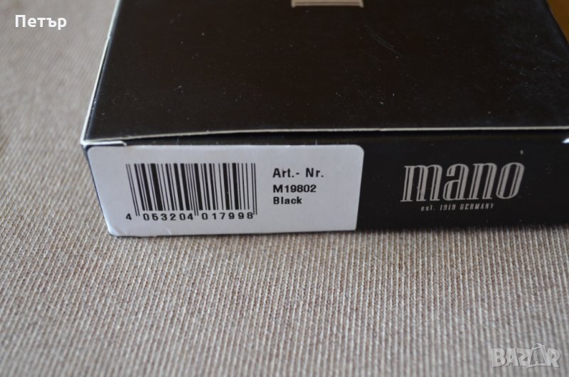 Портфейла е чисто и в оригиналната си кутия. На Германската фирма "Mano 1919" е и е от колекцията MEDIO с номер на модела "M19802". Хоризонтален тип е и е изработен от мека и приятна на допир "черна" естествена кожа. Портфейлът има общо: