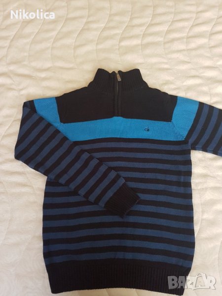 2 .Пуловер Сalvin Klein ( плетиво) .Много тъмно син,със светло сини райета на предницата.Има и малко ципче.ИДЕАЛЕН ВИД! КАТО НОВ!