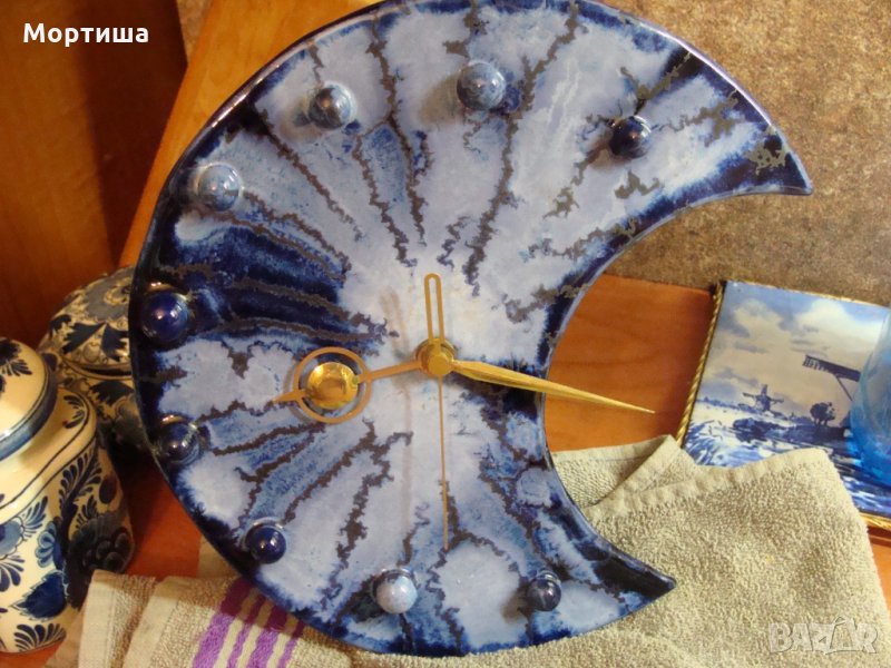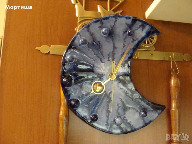 Великолепен стенен часовник Мурано във форма на луна с месингови стрелки .Кварцов механизъм Проблем със стрелката за секундите пада( съобразено е с цената ) .иначе си върви но трябва майстор да го види .Купуван е за 230 евро Крайна цена без бартеР