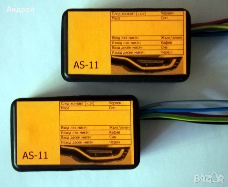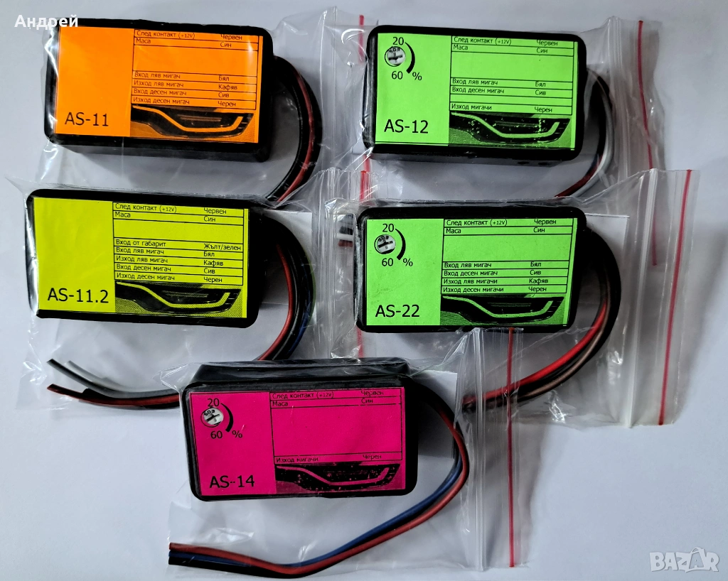 AS-14 – След стартиране на модула мигачите винаги светят на зададения процент. При подаване на мигач, активния свети "Силно..Слабо..Силно..Слабо", докато другия остава да свети с настроената яркост. Регулиране силата на светене 20..60%. Захранване след подаден контакт или от габарит. Цена 15€.