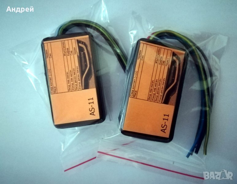 AS-11 - когато няма задействан мигач, модула подава захранване 12V към крушките на мигачите и те светят постоянно на 100%. При подаване на произволен мигач или аварийни, модула се изключва и мигачите /аварийни/ функционират по стандартния начин. След изключване на мигачите модула изчаква време 1,5S и отново подава захранване към мигачите, за да светят постоянно. Може да бъде захранен след контакт или от габарит, като в първия случай се активира при подаване на контакт а във втория при включване на габарит /нощно време/ Цена 14€.