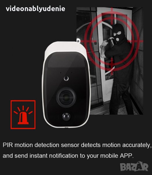 С вградения PIR сензор за движение с широкоъгълен IR обхват, IP67 влагозащитен дизайн за работа в различни метеорологични условия и захранване от ултра мощните презареждаеми модел 18650 батерии, тази охранителна камера е идеалния „