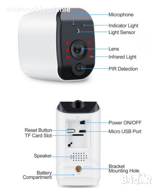 Напълно самостоятелна автономна безжична камера на Li-ion батерии с карта памет слот за външен монтаж с 2 Mегапикселов CMOS сензор и висока FULL HD резолюция от 1080P и фиксиран 2.8мм обектив с ъгъл на виждане от 166 градуса хоризонтално и 110 градуса вертикално!