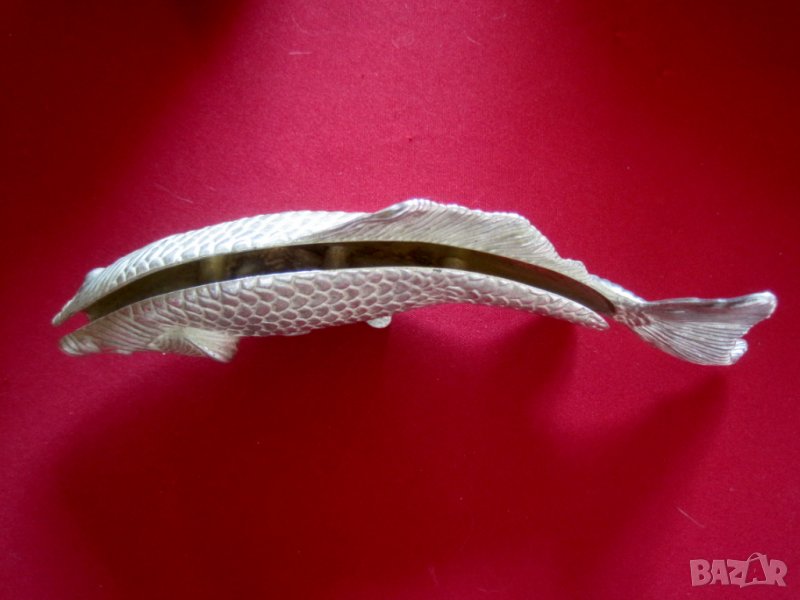Сребърно шаранче. Риболовен сувенир, подарък за рибар, риболовец и др. Красив винтидж държач за писмо, антикварен салфетник, сребро с форма на плуваща риба, бижу за декорация. Превъзходна ювелирна изработка, произведен в Италия през 1950 г. Сребърен, сертифициран модел на Vintage Modello Depositato. Дължина 23 см. тежък 290 гр. Вътре има релефен надпис "Modello-Depositato".
