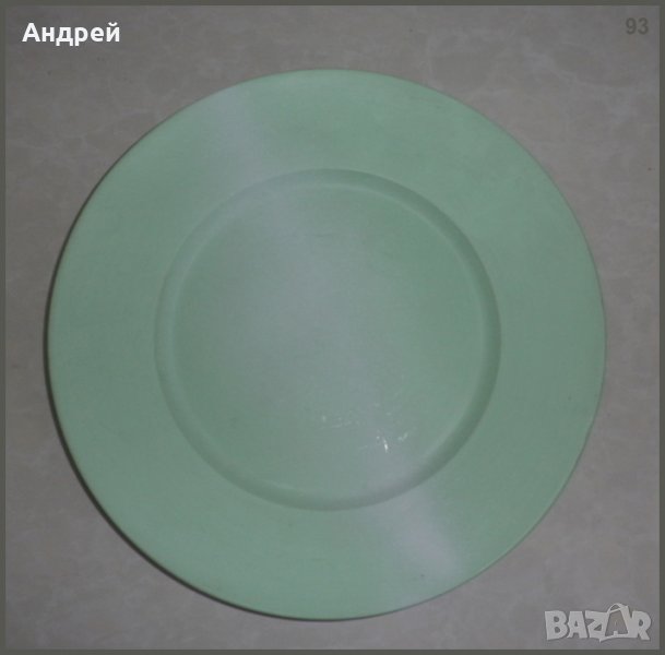 Плоската чиния е с диаметър-27 8 см.,като тази и големина позволява с нея да се сервира сериозно количество плодове,сладки(солени)лакомства,или…каквото там има…На лицевата страна е оцветена с много светло зелено(резедаво),преливащо до бяло и обратно.А че е нова съдя по етикета с бар код,намиращ се на гърба на керамичната чиния.