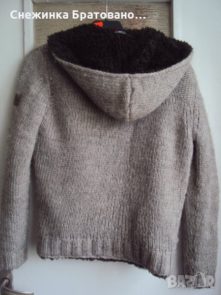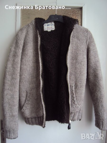 Много топъл, пухкав и стилен.Преждата е вълна. За ръст 164 см. Купен от Италия. Няма забележки по него.Състояние до Ново! С качулка. Размери: Дължина на ръкава 63 см. Цяла дължина на гърба 61 см. Гръдна обиколка 102 см. С подплата от косъм. Отпред има джобове. За есенно-зимен сезон е много практичен.Дори и по-дебел и от топло яке!