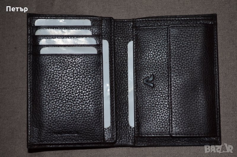 страна. Надпис на фирмата отпред на портфейла и малко лого от