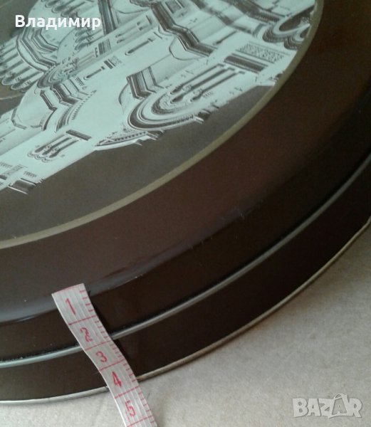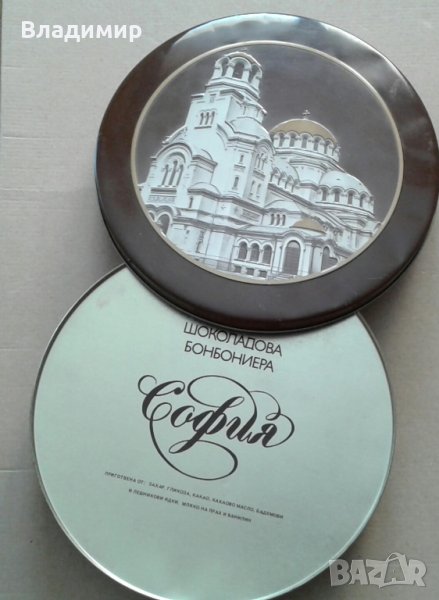 Продавам метална кутия с релефно изображение на капака на катедралата "Св.Александър Невски"-София; размери- диаметър 25 см. , височина - 4 см. , запазена, с нормални следи от употреба при отваряне.Цена 12 лева.