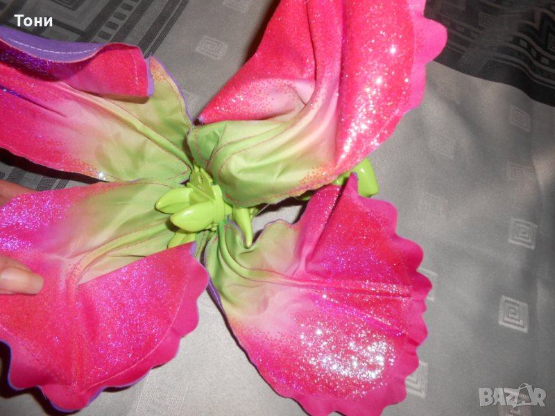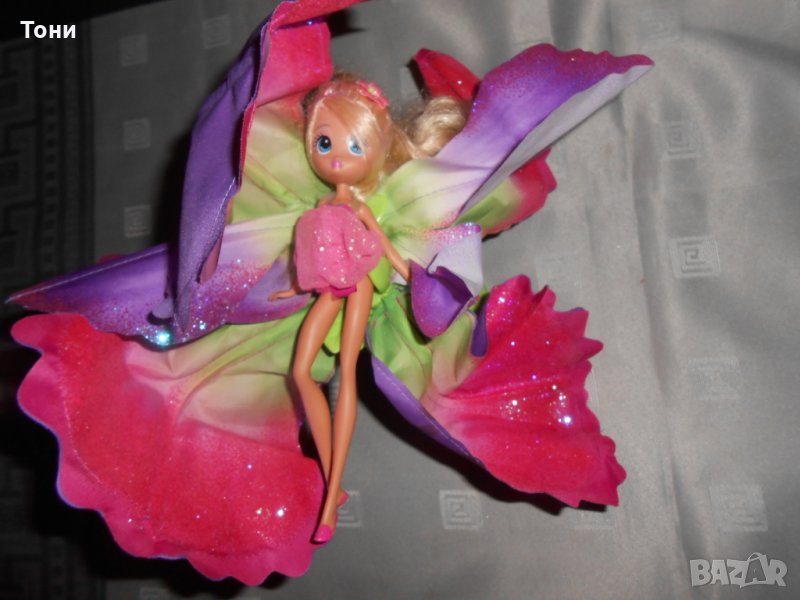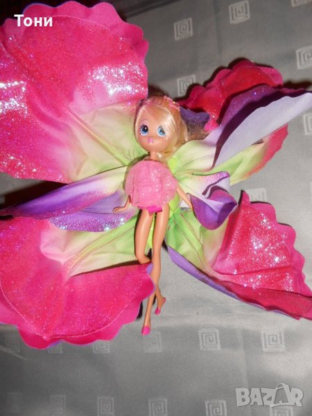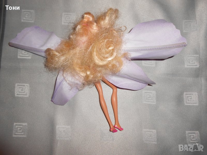 Малка кукла Барби с крила по-себе си във формата на цвете и самото цвете в което седи .