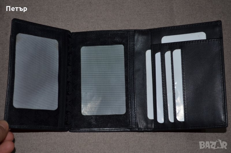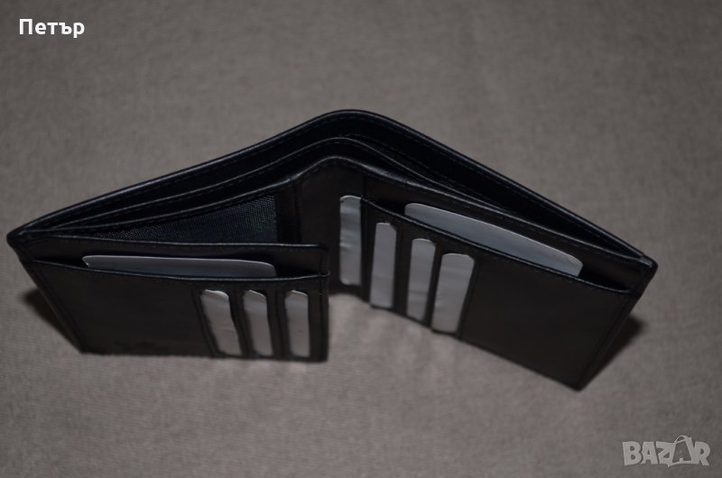 - 2 отделения с мрежа за лични документи. Метално лого с надпис на фирмата отпред на портфейла и лого от вътрешната страна.