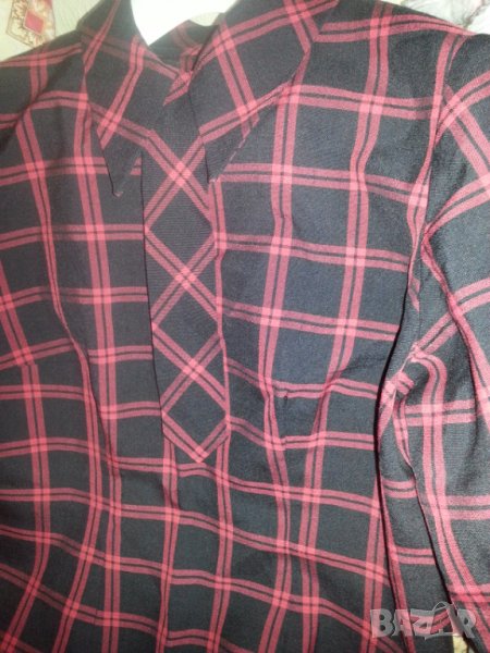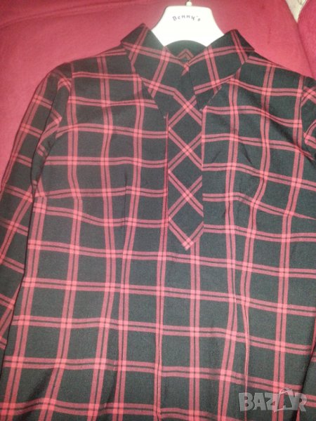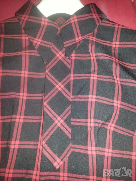 Рокля с дълъг ръкав, плътна немачкаема материя - тропикал, с яка и платка вратовръзка отпред със закопчаване, цвят черни и червени квадрати, размер М, или № 44-46 български номер.