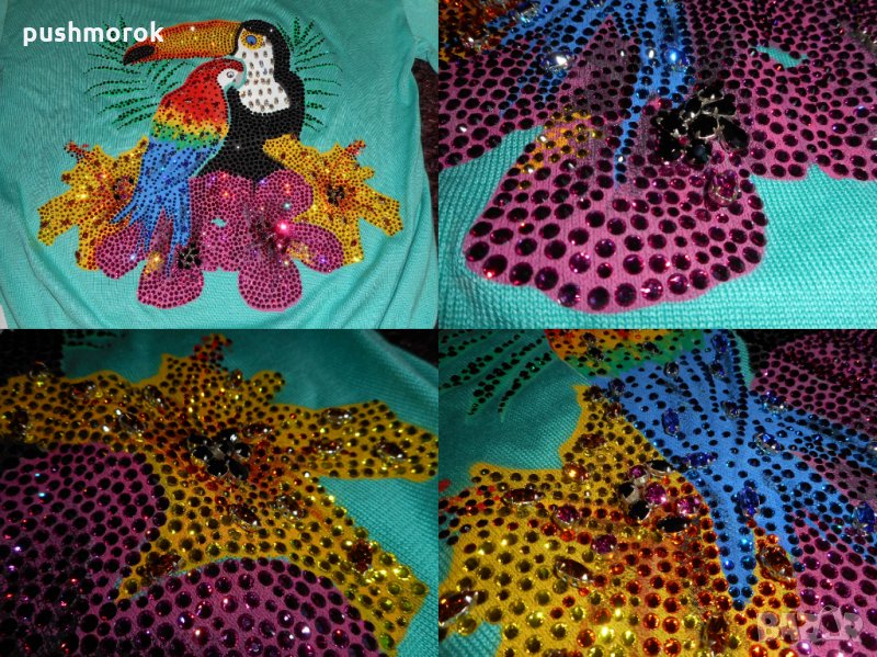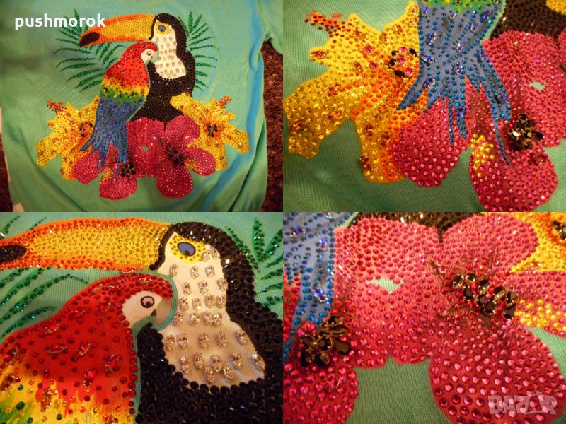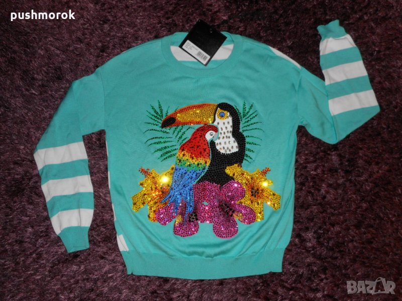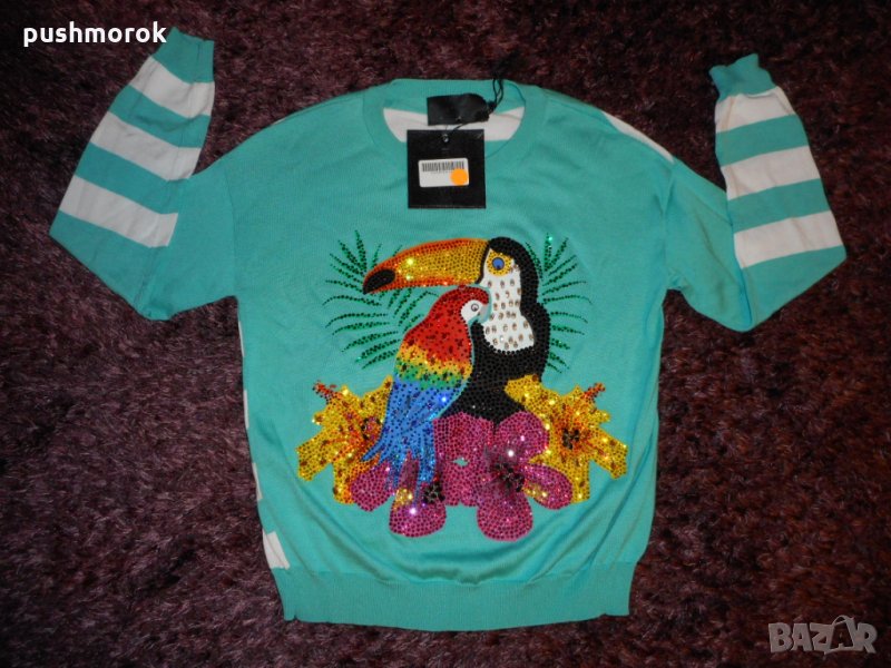 цветен пуловер с тропически печат отпред, украсен с многобройни камъни от стъкло! Май