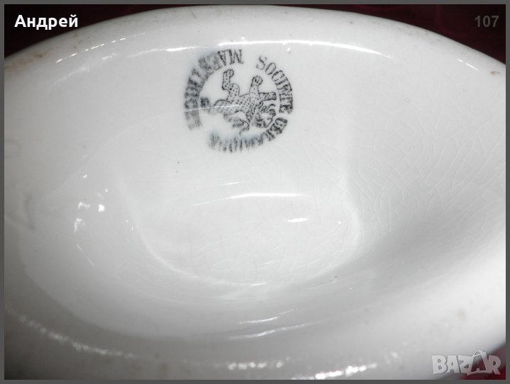 Бялата порцеланова сосиера,както е показано на снимките,несъмнено си има следи от предишна употреба-малка,несъществена пукнатина от едната страна и 2 mm откършено,вероятно при…”нерегламентиран” удар.Това според мен е нормално,съдейки по,едва ли не,”античния” вид на порцелановата сосиера,тя е „преживяла” доста…”битки”…На гърба си порцелановата сосиера има щемпел,показващ,че тя е от немски порцелан.Размерите и са:дължина-22 см.,височина-14 см.,ширина-8,5 см.