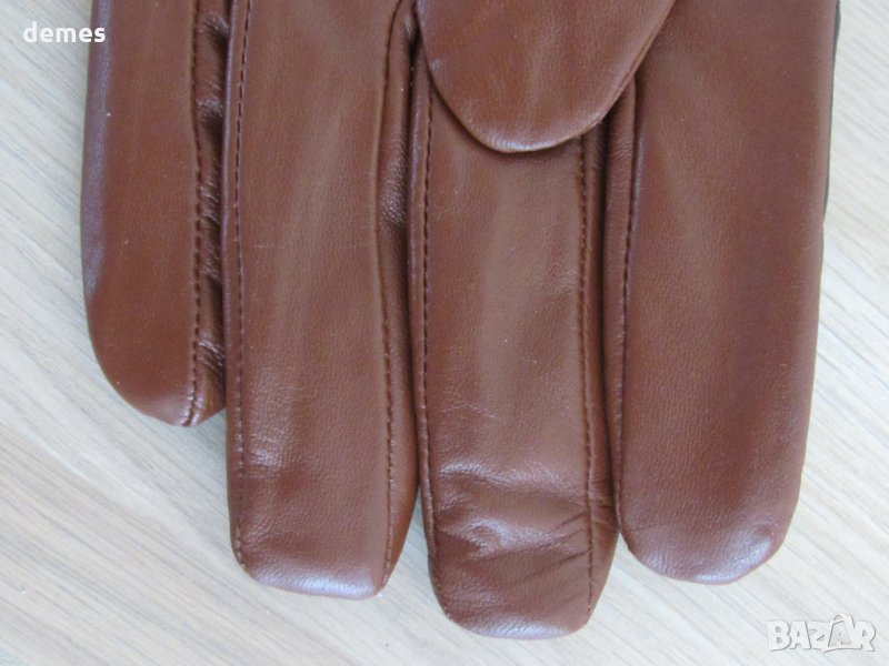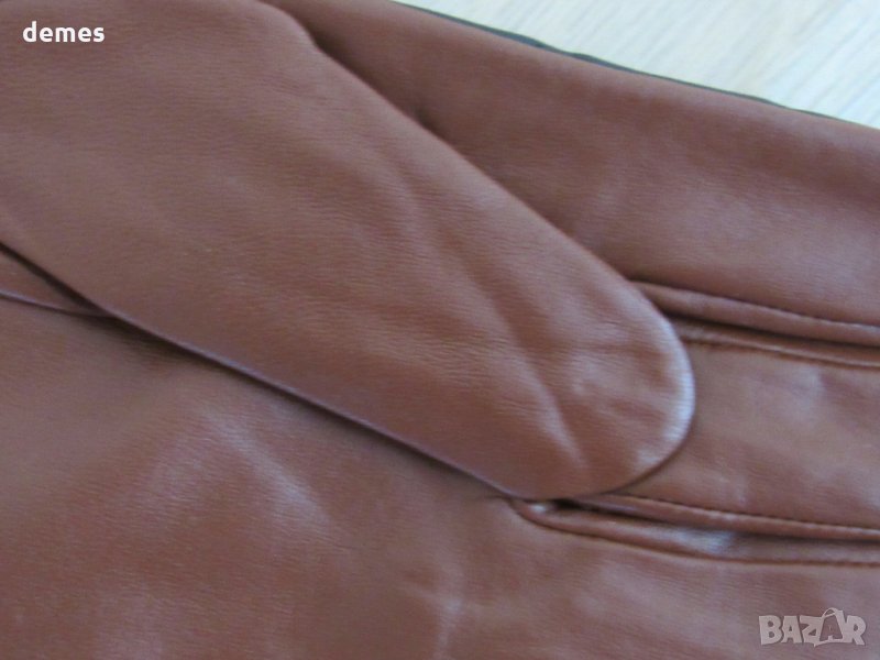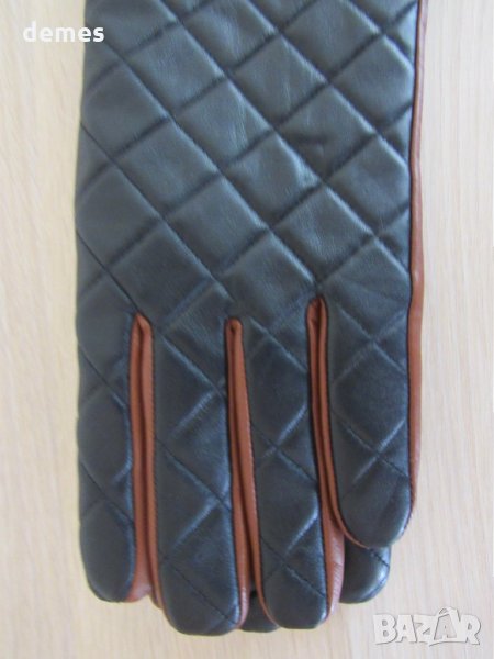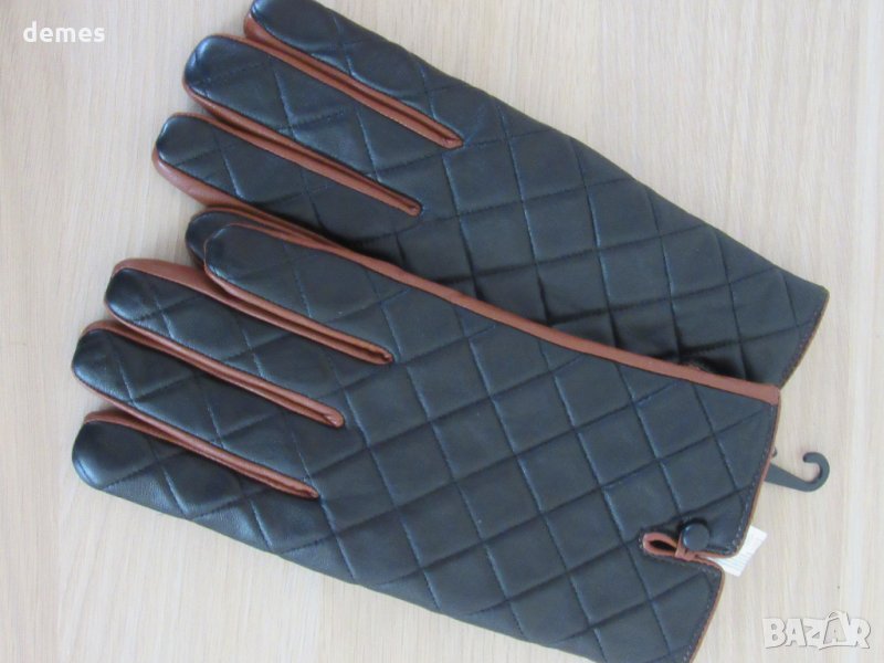Ръкавиците са комбинация от кафява и черна кожа. Изключително фини и елегантно. Горната част е черна, на ромбчета , с дискретно копче. Долната част е от кафява кожа. Комбинацията е много сполучлива. Кожата е обработена изключително фино. Нови, с етикет. С фина подплата. Размер L-дължина 25 см, ширина-11 см.