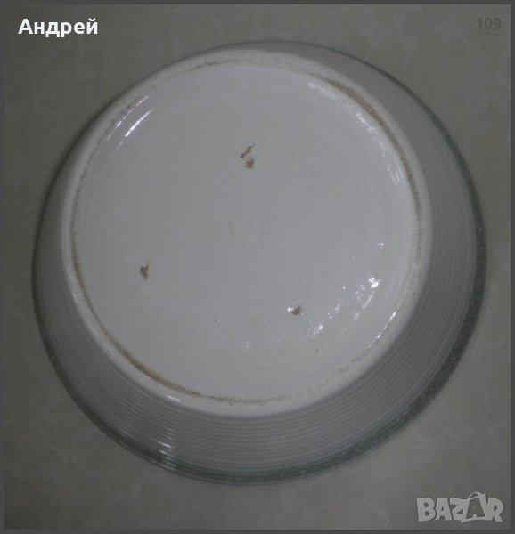 Керамичната фруктиера е с размери:диаметър-21,5 см.-горе, и диаметър на дъното-13,5см.височината е- 10,2 см. По дъното на фруктиерата се забелязват едва доловими следи от предишна употреба.С големината си съдът може да се използва и като купа за,,,”семейни” салати,например,или…абе,това го оставям на Вашето въображение...