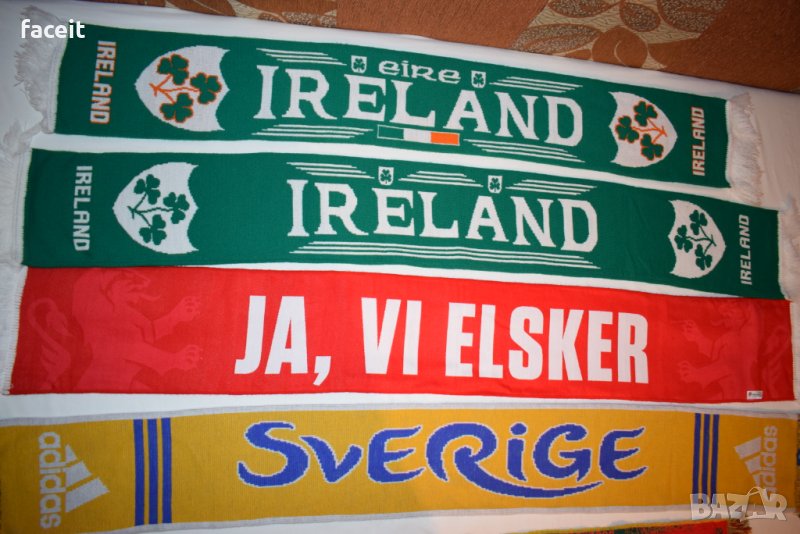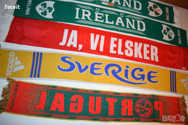 Здравейте, продавам страхотни футболни шалове на нациоалните отбори на Ирландия, Норвегия, Швеция и Португалия. Шаловете са много красиви, меки, здрави и удобни. Шаловете са в перфектно състояние. Идеални за феновете на отбора! Изпращам до цялата страна по Еконт или Спиди!