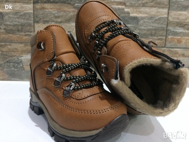Детски боти от еко кожа и топъл хастар.Модела е с връзки и страничен цип.Имат висока подметка от термокаучук и дълбок грайфер.
