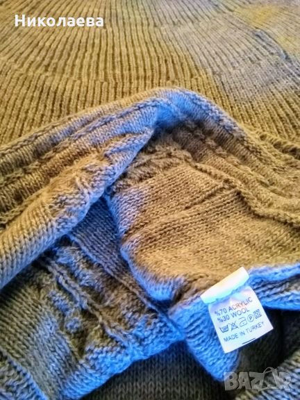 Нова плетена(машинно) къса рокля-туника,с поло яка и реглан ръкав.70% акрил,30% вълна.Размер M/Дължина от основата на яката 71 см +21 см дължина на поло яка (с ширина 20см). Дължина ръкав от основата на яката 67 см,от мишница 42 см.Ширина от мишница до мишница 40 см+ 12 -13см при разпъване.Ширина в долния край 57 см.