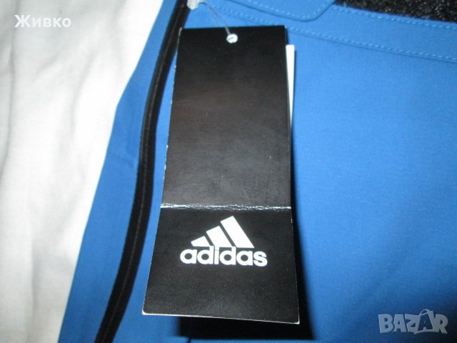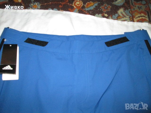 Adidas нов, с етикет син водоустойчив панталон с мембрана. Обиколка на талията около 100 см, но може да се притяга с лепки. Дълъг е, може да се скъси. Дължина от горе до долу- 113 см. Дължина от чатала до долу- 84 см. От двете му страни по цялата дължина има ципове, може лесно да се свали. Може да се пакетира в джоба си. В бедрата е по-широк, свободен е. Произведен през месец Юли 2017 година.