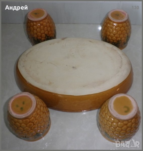 Керамичната тава е с размери:дължина-26 см.,ширина-18 см,.височина-8,5 см.,правещи тавата(подноса)подходяща,както за приготвяне на многобройни (като видове) ястия,така и за сервиране на плодове,мезета,десерти,и т .н..Керамичната тава чудесно си подхожда(визуално) с керамичните чаши,които са четири на брой,и става,и за техен поднос.Керамичните чаши богато и релефно са инкрустирани и оцветени с грозде,което да ни напомня,че са идеални за вино,но…не са за „сериозни” пиячи,защото са с размери:диаметър-6,5