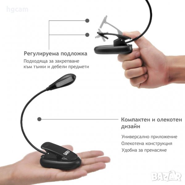 Продуктът разполага с монтажна скоба(клип) и напълно гъвкаво рамо, което ви позволява да позиционирате и фокусирате светлината точно там, където искате. Здравият клип захваща почти всичко в това число: книга, четец, таблет, лаптоп, бюро и прочие