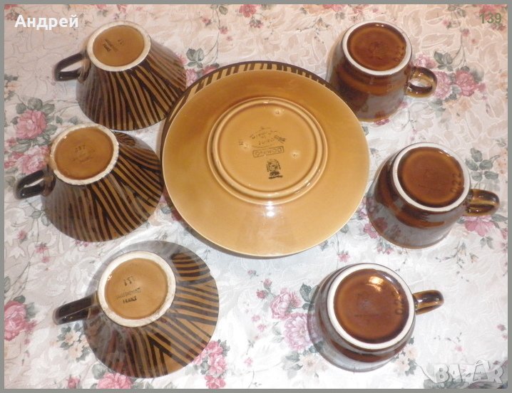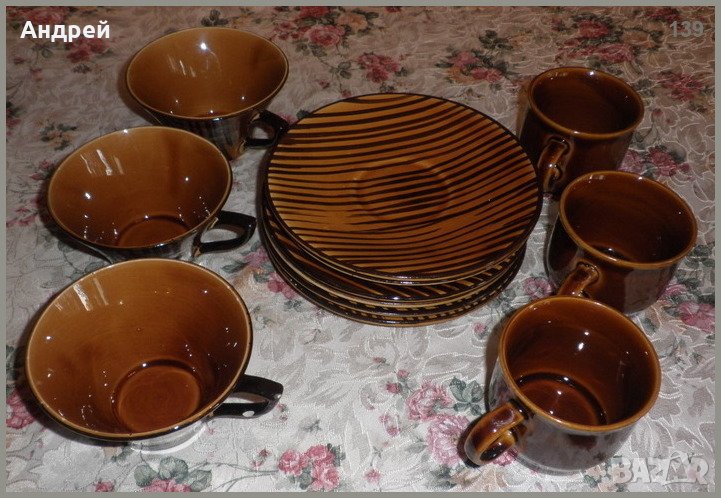 Става въпрос за шест керамични подложни чинии и към тях по три броя керамични чаши с различна форма и големина,но в сходна цветова гама.Керамичните чинии са с размер:диаметър-17,3 см.,което казва,че освен за подложни,мгат да се използват и за сервиране на…”разуми” количества десерти,мезета,бонбони и…други вкусотии.По-големите чаши са с размер:горен диаметър-11 см.,долен диаметър-5 8 см.,височина-6,2 см.,и вместимост-200ml,което ги прави „годни” както за чай,така и за кафе.А…може и за топло мляко…На дръжката на една от по-големите керамични чаши се забелязва (показано е на снимките!) следа от предишна употреба. По-малките керамични чаши са с размер:диаметър-8 см.,висчина-6,6 см.,и вместимост-100ml.,удобни за кафе,или…”прикритие”на някоя доста „по-твърда” течност…според случая…J На всички керамични съдове от лота има печат на производителя.