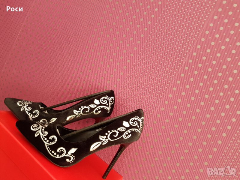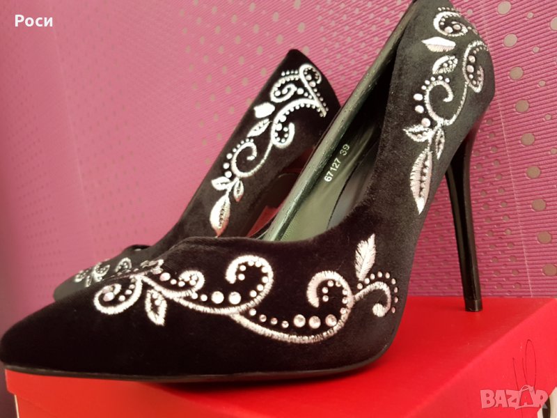 Уникални елегантни дамски обувки с бродерия върху велурен материал--- Височина на тока е около 10 см... Перфектни за абитуриент или друг официален повод по ваша преценка.... Нови, размер - 39