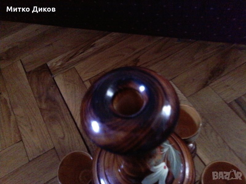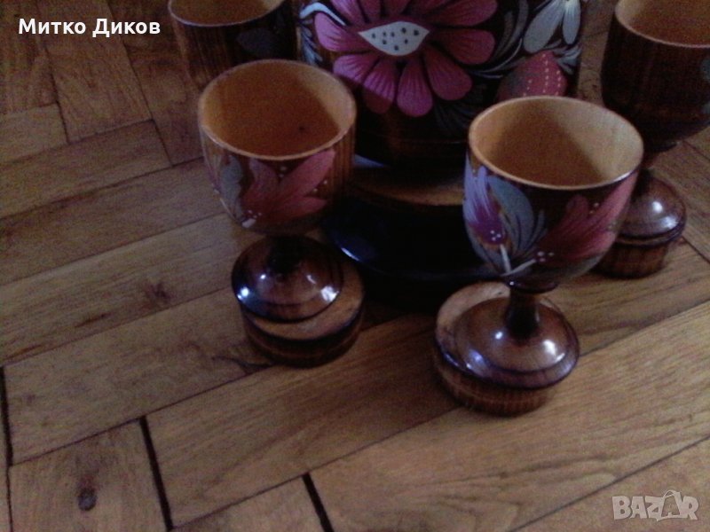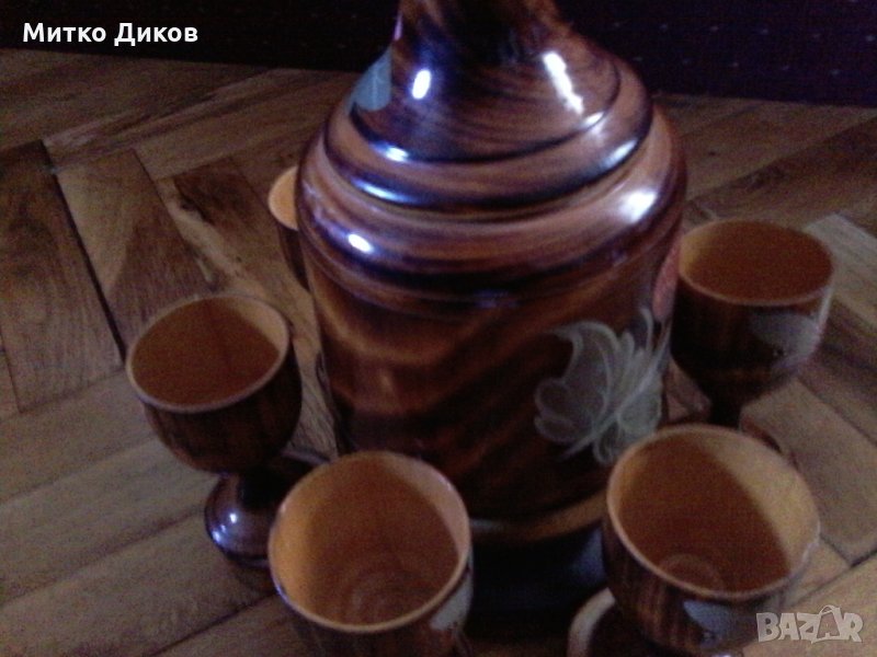 Ръчна изработка са бутилката с размер височина 230мм и ширина 110мм и чашите с височина 90мм и диаметър 45мм -стойката с височина 70мм и диаметър112мм-отлично състояние-изпращам по еконт с отстъпка