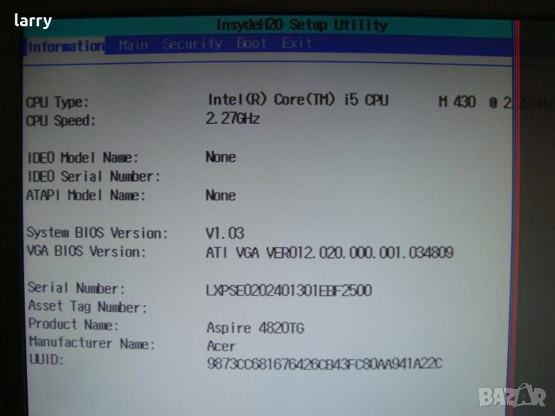 Продавам лаптоп Acer Aspire 4820 на части. Останаха само: Процесор: Intel Core i5-430M - 40лв
