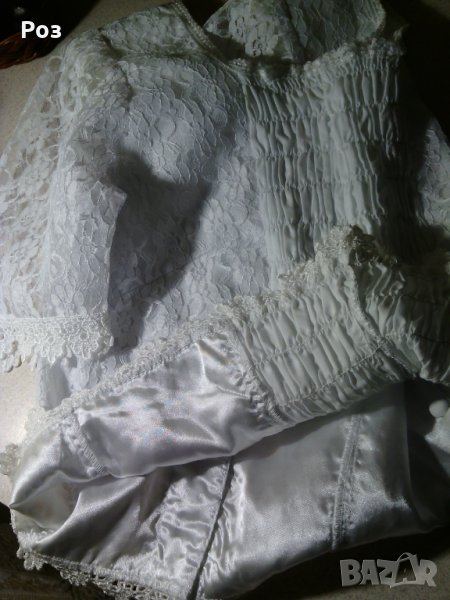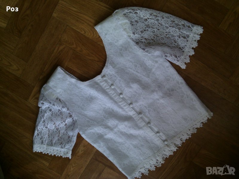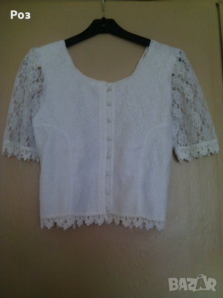 Снежно бяла дантелена блузка. Облечена стои много красиво и нежно. Подплатена е отпред и на гърба. Отговаря на размер С / М . Обличана е само един път по повод, за няколко часа.