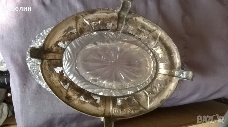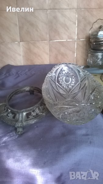 стара фруктиера.основа от цветен метал с кристален съд/не е оригинален/.височина 15см,дължина 31см,ширина 14см.