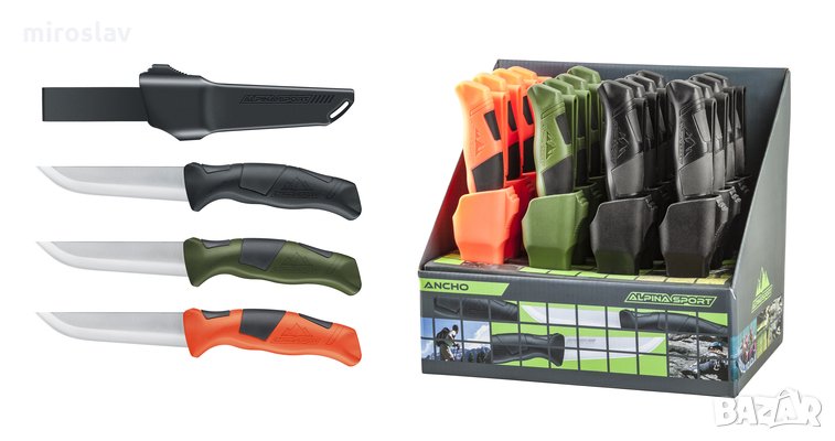 Нож Alpina Sport Ancho. Неръждаема стомана 420 SS. Ножът има удобна ергономична полимерна ръкохватка с частично гумирано покритие. Полимерна кания с възможност за носене на колан. Предлага се в три цвята: оранжев, зелен и черен.