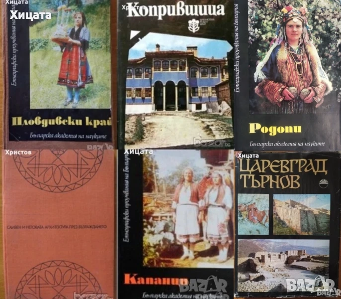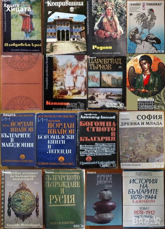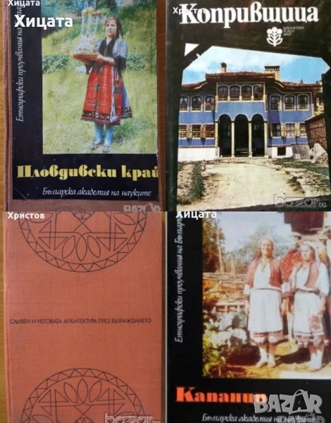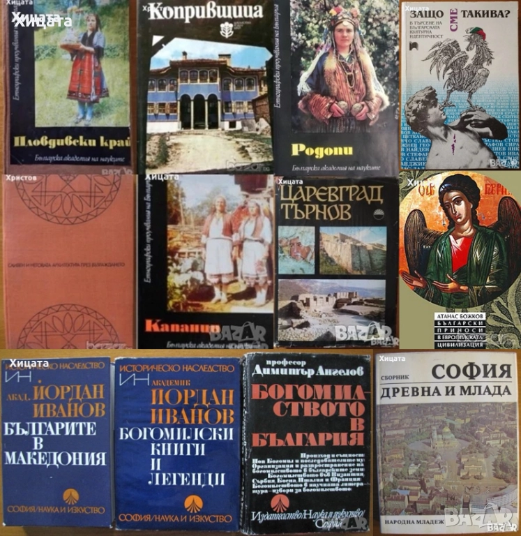 Майстор Никола Фичев (Уста Колю Фичето) 1800-1881,Наука и изкуство,1953г.124стр.Изключително запазена! - 150лв Майстор Алекси и майстор Колю Фичето,Георги Стойков,Септември,1976г.176стр. - 50лв Слънчови повратки. Българските празници, предания и обичаи,Лозинка Йорданова,Емас,1998г.160стр.Отлична! - 75лв Човекът с яшмака.Книга 1,Мер Ил,М&М,2007г.440стр.Отлична с леки забележки ! - 30лв. За Богомилите от уста на ухо,Дамян Попхристов,Изд.ВББ,2015г.306стр. - 70лв. Похитеното съкровище на богомилите,Христо Буковски,Сиела,2015г.432стр. - 70лв. Пловдивски край.Етнографски и езикови проучвания,БАН,1986г.390стр. - 350лв. Капанци,Колектив,БАН,1985г.378стр. - 350лв Родопи.Етнографски проучвания,БАН,1994г.296стр. - 350лв Български приноси в европейската цивилизация,Атанас Божков,Булвест-2000,424стр. - 150лв. Български приноси в Европейската цивилизация,Атанас Божков,Булвест 2000,424стр. на Английски език - 150лв. Отлични! Защо сме такива?В търсене на българската културна идентичност,Иван Еленков,Румен Даскалов,Просвета,1994г.496стр. - 130лв. Копривщица,Иван Врачев, Кольо Колев,1980г.изд.Отечествен фронт,340стр. Отлично състояние! - 100лв. Сливен и неговата архитектура през Възраждането ,Рашел Ангелова ,БАН,1969г..700бр.тираж! - 100лв. София, мислена в пространството и отвъд времето,Арх. Христо Генчев,изд.АрхЛибри,2009г.304стр. - 100лв.София - древна и млада,Сборник,Изд.Народна младеж,1980г.432стр.- 80лв Царевград ТърновТом 1:История на проучванията, архитектура, надписи,монети,културни пластове преди изграждането на двореца,БАН,1973г.356стр. - 80лв. KOPRIVSHTITSA HISTORY AND ARCHITECTURE (Копривщица история и архитектура - фотоалбум 150 фотографии - изгледи, къщи, интериори, резби, тавани, стенописна украса, тъкани, с анотации, специален подаръчен формат - на английски език),Viara Kandjeva, Antoniy Handjiiski,ИК "Борина",2005г.160стр.Отлична! - 50лв. Богомилски книги и легенди,Йордан Иванов,Наука и изкуство,1970г.400стр. - 60лв. Българите в Македония,Йордан Иванов,Наука и изкуство,1986г.494стр. - 60лв. Богомилството в България,Димитър Ангелов,Наука и изкуство,1969г.564стр. - 60лв.Древна история на Балканския полуостров.Том 1.Опит за съпоставително изследване на конните народиКръстю Мутафчиев,Гуторанов и син,1998г.324стр.Изключително запазена! - 50лв Българското възраждане и Русия,Наука и изкуство,1981г.596стр.Минимален тираж!Отлично състояние със забележки по обложката - 80лв История на българите 1878-1944 в документи.Том 1: (1878-1912). Част 1: Възстановяване и развитие на българската държава Величко Георгиев,