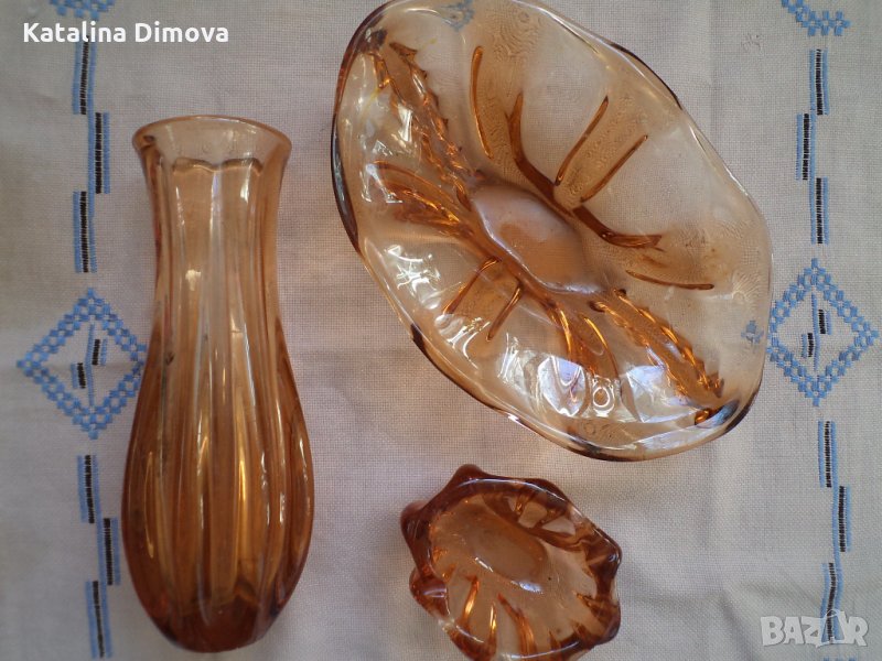 Комлектът е запазен, почти неизползван. Размери на вазата вис. 30 см, дъно-6см, горе-9,5см; голчма купа дължина-32 см, вис.-7 см; малка купа дължина-15 см, височина 6 см.