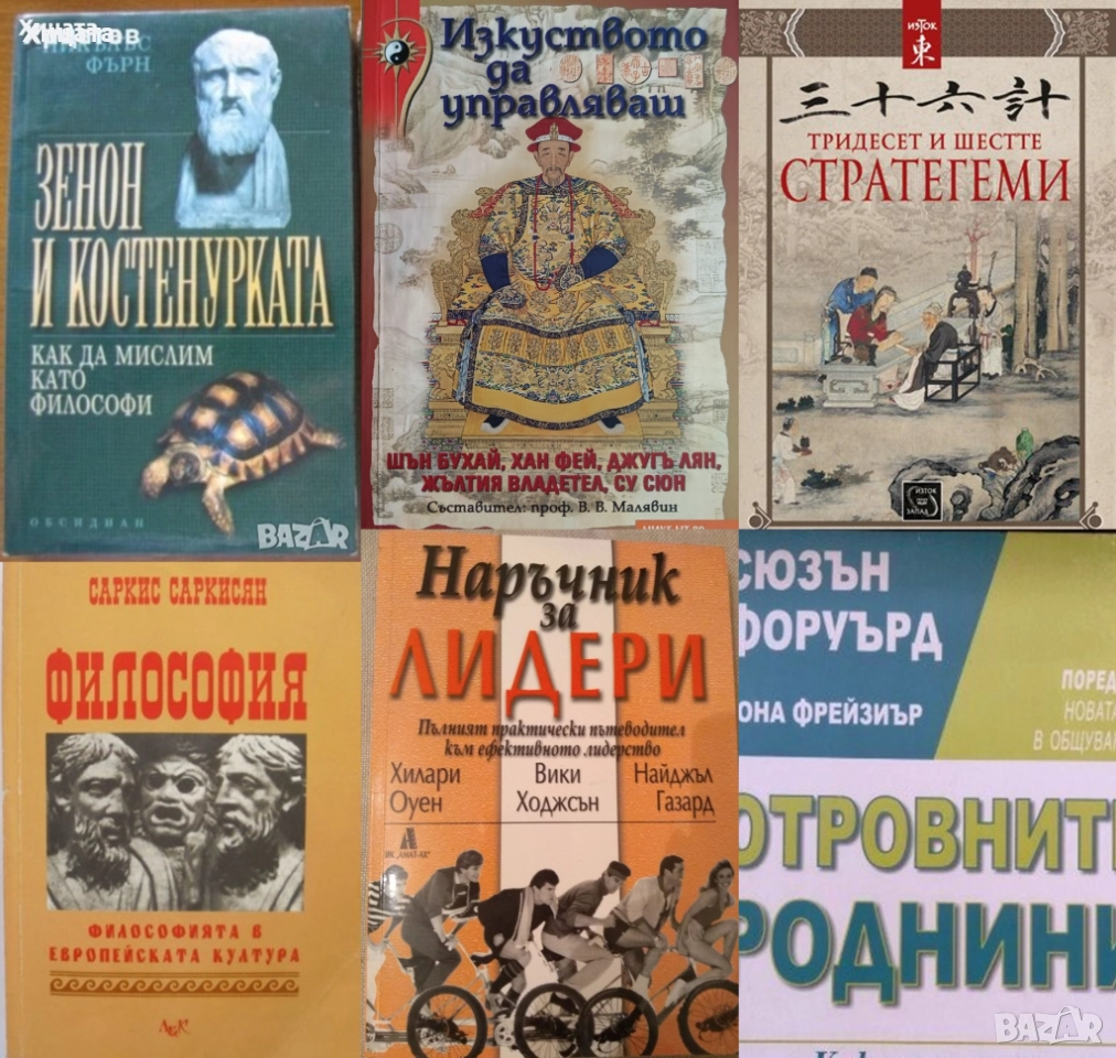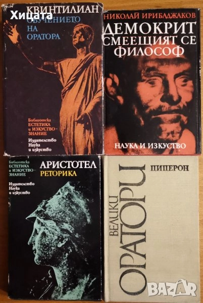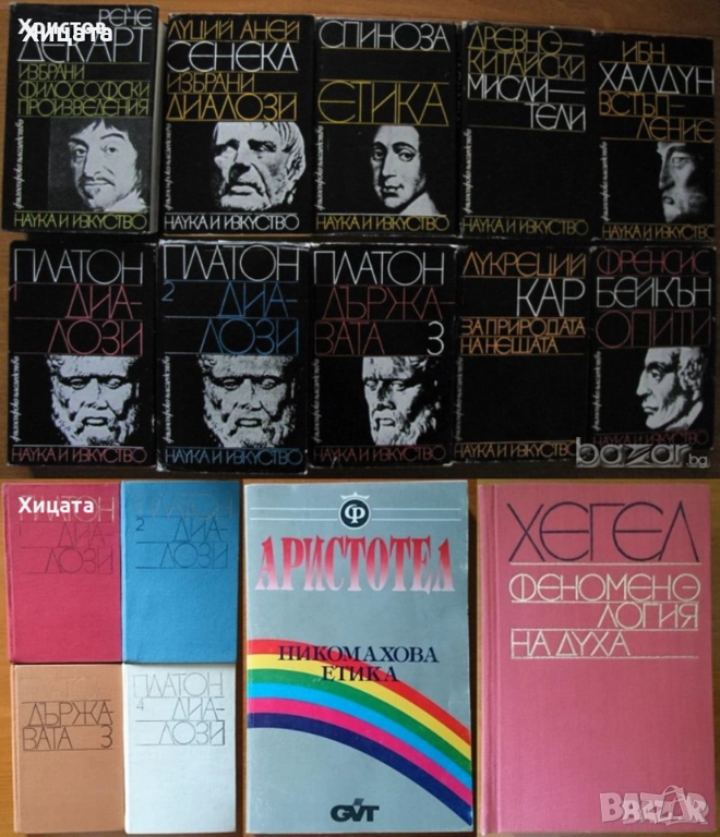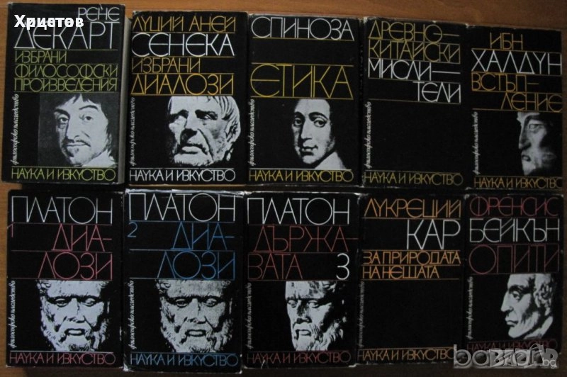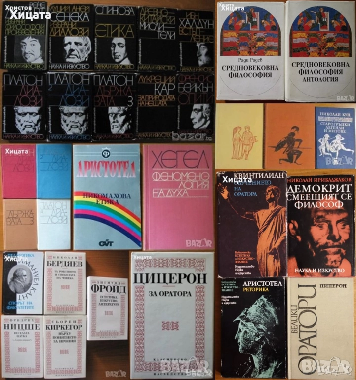 Обсидиан,2003г.224стр. - 120лв Тит Лукреций Кар,За природата на нещата - 90лв; Въведение във философията,Иван Върбанов,Международно висше бизнес училище,2007г.500стр. - 90лв Модерната мисъл:Интелектуалната история на ХХ век.Книга 2,Питър Уотсън,Кръгозор,2004г.574стр. - 90лв Семиотичната идея, Русен Русенов,Лик,1998г.374стр. - 80лв Матрицата на несъзнаваното.Философска реконструкция на психоанализата,Вяра Николова,Проф. Петко Венедиков,2006г.256стр.Изключително запазена! - 50лв Енциклопедичен речник от Авгий до Яфет,Сергей Влахов,УИ "Св. Климент Охридски", д-р Петър Берон,1996г.432стр.Отлична! - 50лв. Кратка история на философията,Сава Гановски,Наука и изкуство,1973г.506стр.Изключително запазена! - 50лв Пътешествия с Херодот,Ришард Капушчински,Изток-Запад,2008г.288стр.Отлична! - 50лв. Исус и есеите,Долорес Кенън,Аратрон,1998г.400стр. - 65лв. Система на трансценденталния идеализъм,Фридрих Шелинг,Наука и изкуство,1983г.382стр.Отлична с леки забележки по обложката! - 90лв. Фридрих Шелинг,Изложение на моята философска система - 50лв. Философия на изкуството,Фридрих Шелинг,Наука и изкуство,1980г.468стр.Отлична - 50лв. Пролегомени.Към всяка бъдеща метафизика,която ще може да се представи като наука,Имануел Кант,Наука и изкуство,1969г.280стр.Отлична със забележки по обложката! - 60лв Диалози.Том 1-4,Платон,Наука и изкуство,1979-1990,2244стр.- 350лв. Отделно:Том 1 без обложка - 70лв. Том 2,без обложка - 90лв.Том 3,Държавата с обложка - 40лв. Никомахова етика,Аристотел,Отлична! - 90лв. Обучението на оратора,Квинтилиан,Наука и изкуство,1982г.792стр. - 120лв. Реторика,Аристотел,Наука и изкуство,1986г.238стр. - 40лв.Велики оратори:Цицерон,Наука и изкуство,1993г.292стр. - 40лв. Демокрит - смеещият се философ.Философско-историческите и социологическите възгледи на Демокрит,Николай Ирибаджаков,Наука и изкуство,1978г.274стр. - 40лв.Христоматия за двама.Фрагменти:Размисли за живота и смъртта, за литературата и за себе си,Георги Марковски,Сребърен лъв,1996г.352стр.С посвещение и автограф от Георги Марковски. - 60лв Пет средновековни философски трактата,Наука и изкуство,1989г.580стр.Отлична,без обложка - 40лв. Луций Аней Сенека,Избрани диалози,без обложка - 40лв;Френсис Бейкън,Опити - 40лв;Древнокитайски мислители,сборник - 30лв; Николо Макиавели,Избрани съчинения - 90лв;Д.И Писарев,Философски и социологически статии - 50лв;Джон Лок,Опит върху човешкия разум - 90лв;Ламетри,Човекът машина - 40лв;История на философията. Том 2,Хегел, - 25лв. История на философията.Том 3,Хегел - 25лв. Феноменология на духа,Хегел - 25лв Ницше,Веселата наука, УИ "Св. Климент Охридски",1996г 264стр - 70лв. Върху понятието за ирония ,Сьорен Киркегор, УИ „Св. Климент Охридски,1993г.,316стр. - 50лв.Естетика, изкуство, литература ,Зигмунд Фройд ,УИ "Св. Климент Охридски",1991г.608стр. - 90лв. За робството и свободата на човека,Николай Бердяев,УИ "Св. Климент Охридски",1992г. 276стр. - 50лв.Веселата наука,Фридрих Ницше, УИ "Св. Климент Охридски",1996г 264стр - 60лв. Върху понятието за ирония ,Сьорен Киркегор, УИ „Св. Климент Охридски,1993г.,316стр. - 50лв. Спорът на факултетите. Педагогика,Имануел Кант,изд.Христо Ботев,1994г.240стр. - 50лв. За оратора,Марк Тулий Цицерон,УИ "Св. Климент Охридски"1992г.412стр.Отлична! - 50лв.Средновековна философия,Ради Радев - 40лв.Средновековна философия.Антология,Ради Радев - 40лв. Отлични! Старогръцки легенди и митове,Николай А. Кун,Наука и изкуство,1967г.464стр. - 40лв. Старогръцки легенди и митове,Николай А. Кун,Наука и изкуство,1969г.584стр. -