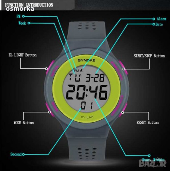Функции: час, дата, ден от седмицата, хронометър, аларма светлина.