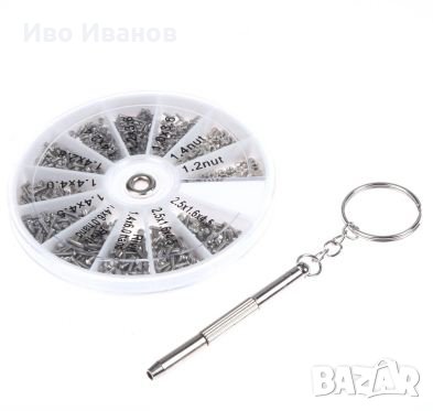 винчета и гайки от неръждаема стомана за ремонт на часовници, очила, в електрониката и навсякъде, където се използват миниатюрни часовникарски винчета. Винчетата са сортирани в кутия.Към комплекта е приложена миниатюрна мулти-отверка-плоска, филипс и глух ключ за гайки.