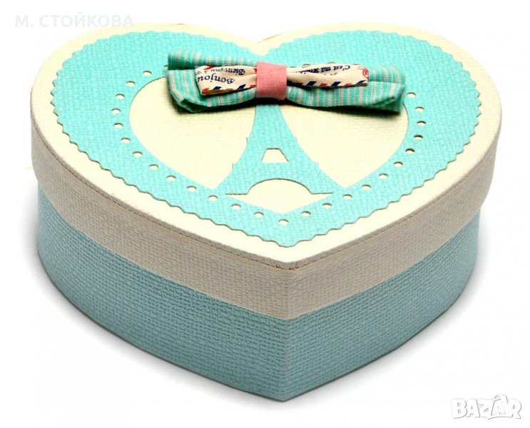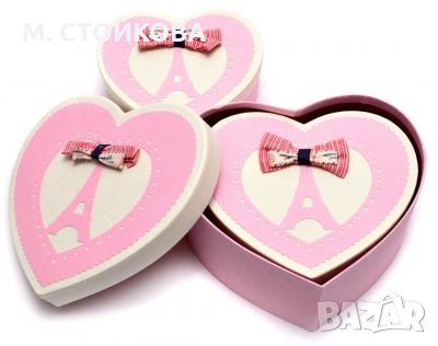 Здрави картонени кутии във формата на сърце, с капаци декорирани с Айфеловата кула и панделка. Подходящи като кутии за подарък, така и за съхранение на лични вещи.