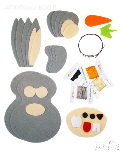Комплектът съдържа предварително изрязани елементи от филц, конци и други материали за изработване на еднo зайче.