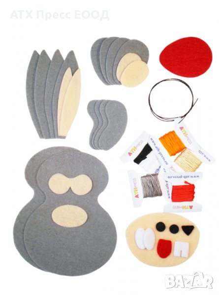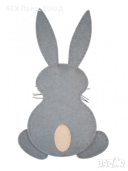 Комплектът съдържа предварително изрязани елементи от филц, конци и други материали за изработване на еднo зайче.