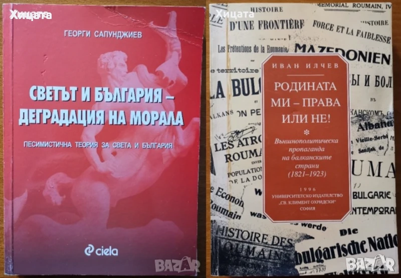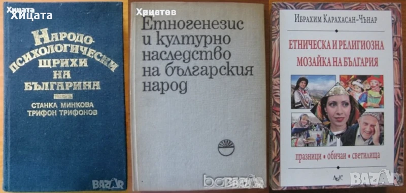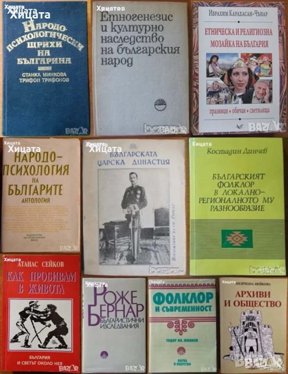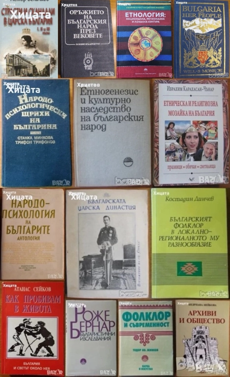 Bulgaria and Her People.With an Account of the Balkan Wars, Macedonia and the Macedonian Bulgars,Will S. Monroe,УИ "Св. Климент Охридски",1999г..412стр. - 95лв Етнология:Национална,регионална и локална култура.Сборник в чест на Цветана Манова,БАН,Марин Дринов,2019г.246стр - 50лв Народопсихологически щрихи на българина,Станка Минкова,Трифон Трифонов,Отечествен фронт,1990г.354стр - 60лв Етногенезис и културно наследство на българския народ,БАН (Етнографски институт),1971 г.160 стр. с разгъваща се карта. - 70лв Етническа и религиозна мозайка на България:празници,обичаи,светилища,Ибрахим Карахасан-Чънар,Лик,2015г.288стр. - 60лв. Народопсихология на българите.Антология,Отечествен фронт,1984г.672стр.Отлична с леки забележки! - 70лв Как пробивам в живота.България и светът около нея,Атанас Сейков,Фондация "Атанас Сейков",2006г.490стр.Отлична с леки забележки! - 50лв Българският фолклор в локално-регионалното му разнообразие,Костадин Динчев,УИ "Св. Климент Охридски",1992г.280стр - 40лв. Фолклор и съвременност,Тодор Ив. Живков,Наука и изкуство,1981г.348стр. Отлична с минимални забележки по обложката! - 60лв Българистични изследвания,Роже Бернар,Наука и изкуство,1982г.570стр. Отлична! - 50лв Българската царска династия,Главен редактор Константин Дончев,сп. "Стрела", печатна база на БЕК 1990г.158стр. - 30лв Архиви и общество,Андриана Нейкова,Софи-Р,2007г.296стр.Отлична! - 50лв Страсти и скандали в Царска България Т.I,II и III ,Петър Величков ,Изток-Запад,2009г.744стр.Отлично състояние! - 115лв. Оръжието на българския народ през вековете,Никола Кълнъков,Военно Издателство,1984г.300стр. - 50лв.Етнографски проблеми на народната духовна култура.Том 2,Изд.Клуб '90,1994г.288стр. - 50лв Етнокултурен диалог на Балканите,Донка Александрова,Човещина,2001г.540стр.Отлична! - 65лв Българско народно изкуство,Христо Вакарелски,1969г. 24х33 см.,168 стр., с цветни и черно-бели илюстрации.На Български език ,без обложка - 250лв Bulgarische Volkskunst /Българско народно изкуство,Hristo Vakarelski /Христо Вакарелски/,Bulgarski Hudojnik,1969г. 24х33 см.,168 стр., с цветни и черно-бели илюстрации. Българско народно изкуство - шевици носии, накити колани, съдове, дърворезби. Албум на немски език. Изключително запазена със забележки по обложката.Имам го и на български език - 250лв Българско народно творчество в тринадесет тома. Том 13: Народни песни с мелодии,Наука и изкуство,1965г.659стр. 2 варианта: Изключително запазена - първата снимка - 180лв; С леки забележки по корицата - втората снимка - 160лв.В памет на професор Стойко Стойков(1912-1969) :Езиковедски изследвания,Сборник,БАН,1974г.616стр. Минимален тираж! - 95лв Вековно наследство.Том 1:Българско народно поетическо творчество,Наука и изкуство,1976г.732стр.Отлична! - 50лв Светът и България - деградация на морала,Георги Сапунджиев,Сиела,2004г.282стр.С автограф от автора!Отлична с леки забележки! - 50лв Родината ми - права или не!Външнополитическата пропаганда на балканските страни 1821-1923 г.,Иван Илчев,УИ "Св. Климент Охридски",1995г.596стр.Отлична! - 70лв Големите български сензации, Росен Тахов,Издателство Изток-Запад ,2005г.655стр. Твърди корици! - 95лв Масовата култура,Богомил Райнов,Наука и изкуство,1974г.876стр.Отлична с леки забележки по обложката. - 50лв Дамаскините в българската литература,Донка Петканова-Тотева,БАН,1965г.260стр.Изключително запазена! - 70лв Музиката в българското радио 1930-1944,Антоанета Радославова-Дойчева,Изд.Петко и Пенчо Славейкови,2010г.394стр.С посвещение и