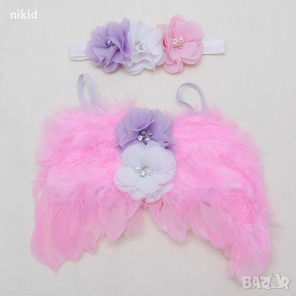 Розово с шарена лента ангелски крила криле и лента цветя за глава за бебе фотосесия фото → Обява 23443815