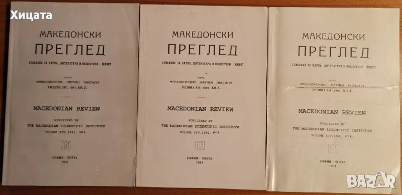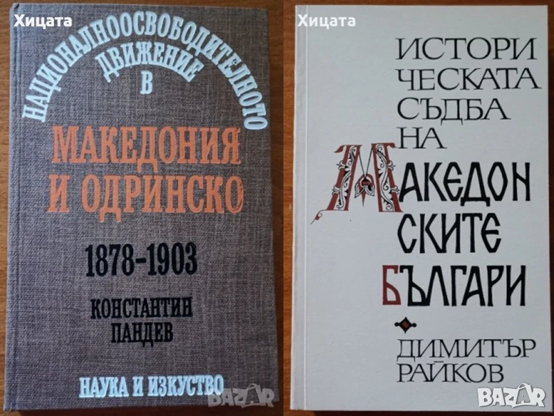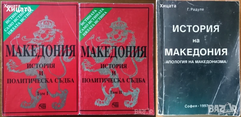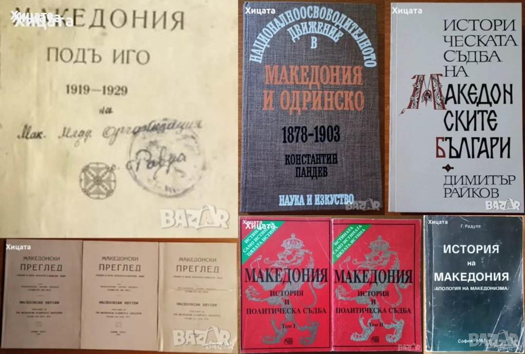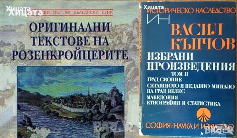 Македония подъ иго.1919-1929,Иван Хаджов/VERITAS - псевдоним на Иван Хаджов от Струга/,Придворна печатница 1931г.775стр. /CXCVI+579стр./ Приложения,илюстрации,факсимилета.Здрава със забележки подвързия,запазено книжно тяло. - 800лв Македонски преглед,1991 г, книга 2;3;4; - 40лв Националноосвободителното движение в Македония и Одринско 1878-1903,Константин Пандев,Наука и изкуство,1979,348стр.Отлична! - 60лв Историческата съдба на македонските българи,Димитър Райков,Македонският научен институт,1997г.376стр.Отлична! - 30лв Македония.История и политическа съдба.Том 1-2,Петър Петров,Знание,1994г-1996г.(336стр.+318стр.)654стр. - 140лв История на Македония.Апология на македонството,Г. Радуле,1997г.448стр. - 50лв За възраждането на българщината в Македония.Неиздадени записки и писма,Кузман Шапкарев,Български писател,1984г.648стр. - 100лв Македонски мартиролог,Цочо Билярски,Анико,2004г.240стр. - 25лв История на международните отношения.Въведение в университетския курс,Евгени Александров,Интела,2000г.400стр. - 100лв Оригинални текстове на розенкройцерите от ХVІ и ХVІІ век,Диана Сливкова,Звездна къща,2001г.318стр. - 80лв Избрани произведения два тома.Tом 2:Град Скопие.Сегашното и недавно минало на град Велес.Македония.Етнография и статистика,Васил Кънчов,Наука и изкуство,1970г.670стр.Отлична с леки забележки по обложката. - 70лв