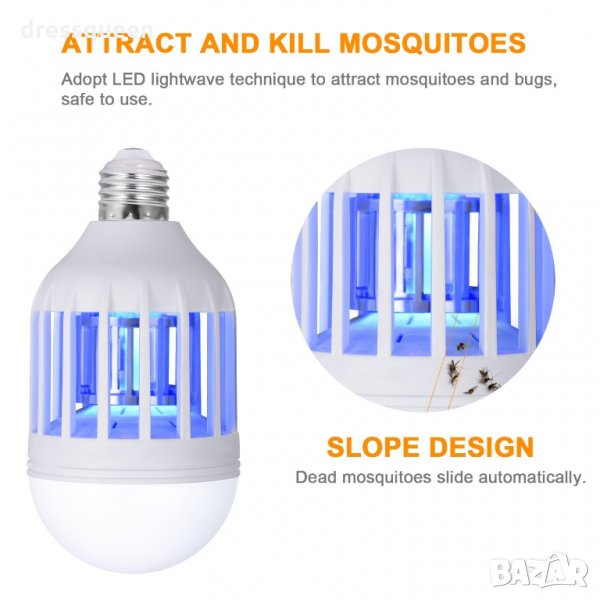 лампа против комари е със стандартна фасунга E27, което е още един голям плюс. Принципа на действие е много прост и това допълнително гарантира дълъг живот на тази лампа: крушката излъчва синя светлина с дължина на вълната 365nm, която привлича комарите към нея. Комарите се елиминират от високоволтова решетка разположена в централната част на крушката. Крушката – лампа против комари е енергоспестяваща и консумира само 3 Вата електричество. Светлината се излъчва от четири светодиода разположени в центъра. Технически характеристики: Захранващо напрежение: 110 – 230 V Синя светлина: DIP F5 Материал: ABS Мощност на елиминиране: 1W Обща мощност: 3W Експлоатационен живот: над 40 000 часа Размери: приблизително 14 х 8 см.